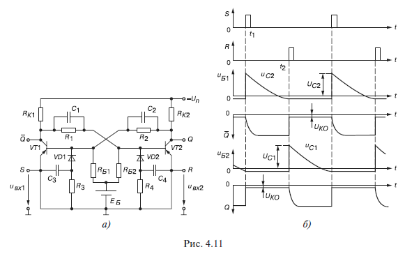 Триггер - электронная схема, имеющая два устойчивых состояния; переходы из одного состояния в другое и обратно совершаются под действием специальных запускающих импульсов. Триггеры широко применяют в цифровых электронных устройствах. Простейшая схема триггера на биполярных транзисторах с внешним смешением EБ приведена на рис. 4.11, а.