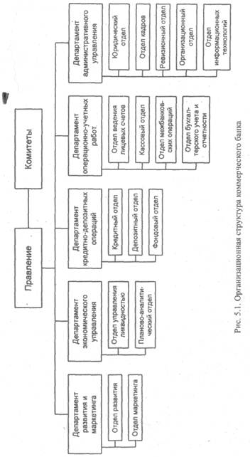 Правление КБ является высшим органом банка, который осуществляет стратегическое управление: определяет траекторные цели и политику банка на основе данных экономического анализа и данных бухгалтерской отчетности; доводит их до департаментов для дальнейшей детализации и исполнения соответствующим отделам; осуществляет общий контроль проводимой банком политики, пересматривает ее при изменении экономической ситуации, а также контролирует состояние банковского портфеля. Правление создает комитеты, которые обеспечивают поддержку стратегического руководства банком, координируют работу различных отделов системы управления. В зависимости от величины банка и его потребностей в России, как правило, создаются комитеты, возглавляемые членами правления: кредитный, ревизионный, исполнительный, доверительных операций и др. Кредитный комитет дает заключения по всем случаям кредитования или превышения установленных лимитов, а также по их определению. Он вырабатывает рекомендации по величине ссудных процентных ставок и структуре кредитов по срокам и видам. Ревизионный комитет обеспечивает регулярные внутренние аудиторские проверки либо своими силами, либо с привлечением внешних аудиторов. Исполнительный комитет обеспечивает проведение экономического анализа (выполнение целей банка, прибыльности, ликвидности и др.), оценку деятельности банка, в процессе которой анализируются основные экономические показатели и отслеживается выполнение траектор-ных целей. В банках с большим числом доверительных операций может создаваться комитет доверительных операций. Департамент развития и маркетинга банка, как правило, включает два отдела. Отдел развития обеспечивает анализ внешней ситуации и, согласовав его с оценкой внутренней ситуации в банке, подготавливает возможные направления политики банка и продвижения его услуг на рынок. Эти решения должны согласовываться с генеральными целями, утвержденными правлением банка. Отдел маркетинга осуществляет оценку конъюнктуры рынка банковских услуг, анализирует соответствие номенклатуры, качества и цены собственных услуг уровню рынка, продвигает свои услуги на рынок, вырабатывая для этого рекламную политику. Этот отдел обеспечивает связь с клиентурой и с общественностью (PR). В развитом обществе существенным является не только объем и качество оказываемых услуг, но и соответствие принятым нормам (поддержка науки, искусства, внимание к окружающей среде). Отдел, с одной стороны, информирует руководство банка обо всех важных событиях вне банка, с другой стороны, объясняет общественности цели банка, его ртратегию. Департамент экономического управления обеспечивает тактическое управление и включает планово-аналитический отдел и отдел управления ликвидностью. Тактический уровень управления необходим для детализации стратегических целей до уровня мероприятий и отслеживания их в дальнейшем как целей, носящих траекторный характер. Отдел управления ликвидностью осуществляет расчет показателей ликвидности банка, их факторный анализ и ежедневный контроль. Планово-аналитический отдел, изучая внутренние банковские показатели, устанавливает планы сбыта (например, число открываемых новых счетов), финансовый план, планирует внутренние мероприятия. Отдел рассчитывает ожидаемую сумм