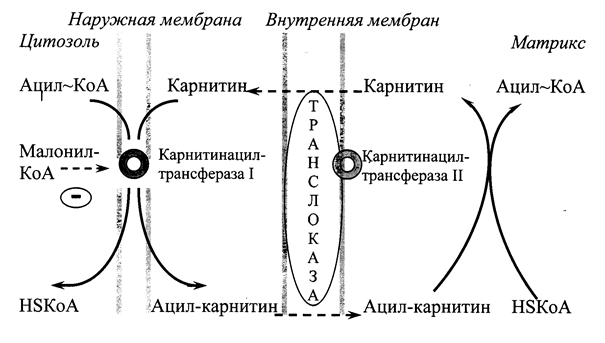 Реакцию катализируют ферменты ацил-КоА-синтетазы. Они находятся как в цитозоле, так и в матриксе митохондрий и отличаются по специфичности к жирным кислотам с различной длиной углеводородной цепи. Жирные кислоты с длиной цепи от 2 до 4 атомов углерода могут проникать в матрикс митохондрий путем диффузии. Активация таких кислот происходит в матриксе митохондрий. Жирные кислоты с длинной цепью, которые преобладают в организме человека, активируются ацил-КоА-синтетазами, расположенными на внешней мембране митохондрий. β-Окисление жирных кислот происходит в матриксе митохондрий, поэтому после активации эти субстраты должны транспортироваться внутрь митохондрий. Этот процесс осуществляется с помощью карнитина, который поступает с пищей или синтезируется из незаменимых аминокислот лизина и метионина. В наружной мембране митохондрий (Рис. 20.1) находится фермент карнитинацилтрансфераза I, катализирующий реакцию с образованием ацилкарнитина. Образовавшийся ацил-карнитин проходит через межмембранное пространство к наружной стороне внутренней мембраны и транспортируется с помощью карнитинацилкарнитин-транслоказы на внутреннюю поверхность внутренней мембраны митохондрий, где фермент карнитинацилтрансфераза II катализирует перенос ацила на внутримитохондриальный КоА. После этого ацил-КоА включается в реакции β-окисления. Свободный карнитин возвращается в межмембранное пространство той же транслоказой.