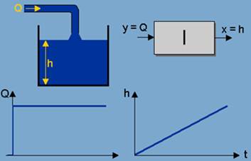Входной параметр – расход поступающей жидкости, выходной - уровень. Изначально емкость пуста и при отсутствии расхода уровень равен нулю, но если включить подачу жидкости, уровень начинает равномерно увеличиваться.