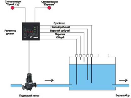 Пример 2. Регулирование уровня в резервуаре, баке, ёмкости При эксплуатаци баков, емкостей и резервуаров часто стоит задача по автоматическому поддержанию уровня жидкости в емкости в заданном диапазоне. Применение автоматики позволяет легко контролировать уровень жидкости, снизить время работы насосов и потребление электроэнергии ими, а также защитить насосы от работы в сухом режиме, то есть при отсутствии жидкости. В систему регулирования уровня входят датчики уровня, регулятор уровня и подающий или опорожняющий насос. Такая система позволяет поддержанивать уровень жидкости в резервуаре, сигнализировать о переливе и защать насос от «сухого хода». На рисунке 2 показан пример системы регулирования уровня. Работа системы организована по следующей схеме. В ёмкости устанавливается пятиэлектродный кондуктометрический датчик (в зависимости от задач электродов может быть меньше). К входу 1 подключается электрод «сухого хода», к входам 2 и 3 – датчики нижнего и верхнего рабочих уровней, к входу 4 – электрод перелива. Пятый электрод осуществляет функцию общего. Система работает на долив от нижнего до верхнего рабочего уровня. Включение насоса осуществляет реле в зависимости от уровня жидкости в ёмкости. Реле обеспечивает защиту насоса от «сухого хода» и сигнализацию об этом. Другое реле используется для сигнализации о переливе. Для предотвращения преждевременного срабатывания защиты от «сухого хода» и от перелива введены задержки включения/отключения реле при смачивании/осушении соответствующих электродов.