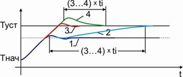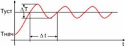 Рис. 8 Переходная характеристика в начале настройки Тнач - начальная температура в системе Туст - заданная температура (уставка) ΔТ - размах колебаний температуры – зона толерантности. Δt - период колебаний температуры tI - постоянная времени интегрирования tD - постоянная времени дифференцирования Установить зону пропорциональности равной размаху колебаний температуры: PB = ΔТ. Это значение служит первым приближением для зоны пропорциональности. Следует проанализировать переходную характеристики еще раз и при необходимости скорректировать значение зоны пропорциональности. Возможные варианты переходных характеристик показаны на рис. 9.