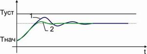 Рис. 11 Дифференциальная компонента (кривая 2) устраняет затухающие колебания Этот этап присутствует только в том случае, если применяется полнофункциональный ПИД регулятор. Если дифференциальная компонента применяться не будет (используется пропорционально-интегральный (ПИ) регулятор), то следует сразу перейти к этапу 3. На этапе настройки зоны пропопрциональности установлена зона пропорциональности, соответствующая переходной характеристике типа 2, в которой присутствуют затухающие колебания (см. рис. 9, кривая 2, рис. 10, кривая 1.). Следует установить постоянную времени дифференцирования так, чтобы переходная характеристика имела вид кривой 2 на рис. 9. В качестве первого приближения постоянная времени дифференцирования делается равной tI = 0,2 tD. tD = 0,2 Δt. Примечательно то, что дифференциальная компонента устраняет затухающие колебания и делает переходную характеристику, похожей на тип 3 (рис. 9). При этом зона пропорциональности меньше, чем для типа 3. Это значит, что динамическая и статическая точность регулирования при наличии дифференциальной компоненты (ПД-регулятор) может быть выше, чем для П-регулятора. Этап 3 Настройка интегральной компоненты tI .