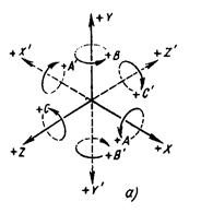 Для управления движением формообразования необходимо однозначно определить все точки рабочего пространства станка. С этой целью используют координатную систему станка, в которой ориентируют обрабатываемую заготовку (изготовляемую деталь), и составляют управляющую программу, определяя траекторию перемещения режущего инструмента. В соответствии с рекомендациями ИСО по ГОСТ 23597 на станках с ЧПУ принята единая стандартная правая система координат (рис.2.1а). Координатные оси системы располагают параллельно направляющим станка, что позволяет напрямую программировать величину и направление поступательных и вращательных перемещения рабочих органов станка.