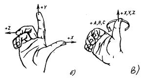 Рис.2.1 Система координат станков с ЧПУ: а - направления движения инструмента и заготовки; б – использование правила правой руки для определения положительных направлений осей координат.