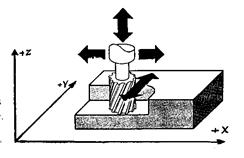 Для определения положительного направления осей координат удобно использовать правило правой руки (рис.2.1б). Ладонь правой руки ориентируется на торец шпинделя. Ось Z совмещается с осью шпинделя, ей соответствует средний палец, указывающий на положительное направление оси Z. Ось X располагается горизонтально, ей соответствует крайний палец, определяющий положительное направление оси X. Оси Y соответствует средний, указательный палец, показывающий на положительное направление оси Y. За положительное направление кругового перемещения А, В, С рабочих органов вокруг соответствующих координатных осей X, Y, Z принято вращение по часовой стрелке при взгляде вдоль положительного направления оси. При пользовании правилом правой руки (рис.2.1б) необходимо крайний, толстый палец расположить по направлению соответствующей оси, тогда остальные согнутые пальцу укажут на положительное направление вращения. Направление стрелок координатных осей X,Y,Z указывает на положительное направление перемещения режущего инструмента относительно неподвижных частей станка. При перемещении заготовки относительно неподвижных частей станка ее положительные перемещения направлены в обратном направлении, и их обозначают индексом соответствующей оси со штрихом X¢, Y¢, Z¢. Т.о. при положительном направлении перемещения инструмента или заготовки имеет место их относительное удаление. Т.о. программируемое круговое перемещение инструмента в положительном направлении обозначают буквами А, В, С, а круговое перемещение заготовки на поворотном столе в положительном направлении обозначают теме же буквами со штрихом А¢, В¢, С¢. В понятие круговое перемещение не входит вращение шпинделя, на котором базируется заготовка, как например на токарном станке, или инструмент, например на сверлильном станке. На рис.2.2 показан пример применения правила правой руки для определения координатной системы вертикально-фрезерного станка с ЧПУ.