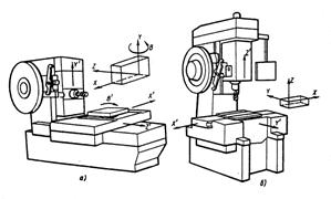 Схема расположения координатных систем на двух станках с ЧПУ фрезерно-расточного типа с горизонтальным и вертикальным расположением шпинделя показана на рис. 2.3.