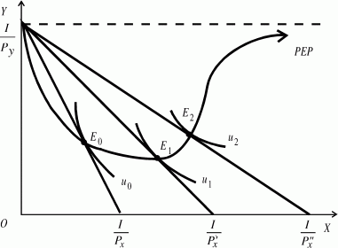 Рис.10. Кривые Энгеля в интерпретации Торнквиста Реакция потребителя на изменение цены. Линия «цена-потребление» Изменение цены на один из товаров при фиксированном доходе ведет к изменению угла наклона бюджетной линии (поворот бюджетной линии), поскольку меняется соотношение цен на товары. Если цена на товар X последовательно снижается (повышается), то каждому значению цены этого товара соответствует своя бюджетная линия. Каждая бюджетная линия касается какой-нибудь кривой безразличия. Все точки касания представляют собой линию «цена - потребление», которая обозначается английскими буквами PEP (Price Expantion Parth). Hа Рис.11. показан поворот бюджетной линии при последовательном снижении цены на товар X с P x до P x", а также построена линия PEP. Hа отрезке от E0 до E1 при снижении цены с P x до P x' увеличение потребления товара X происходит за счет уменьшения потребления товара Y. Угол наклона на этом интервале отрицательный. При дальнейшем снижении цены потребитель становится в состоянии увеличить не только потребление товара X, но и потребление товара Y, о чем свидетельствует положительный наклон кривой PEP на отрезке правее E1. В дальнейшем, когда цена товара X становится совсем маленькой, большая часть дохода потребителя тратится на покупку товара Y. Это показано на графике в приближении линии PEP к пунктирной линии, отражающей максимальное количество товара Y, которое может приобрести потребитель на свой доход.
