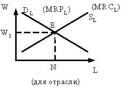 Здесь DL отражает предложение продукта в денежном выражении в данной отрасли; SL показывает предложение труда в альтернативных отраслях. В точке Е MRPL=MRC, т.е. W1 – оптимальный уровень зарплат, а N – оптимальное предложение труда. Эффект замещения (рис. 18.2) наблюдается до точки I: при росте зарплаты рабочие отказываются от свободного времени для увеличения заработка. Эффект дохода после точки I: рабочие при высокой зарплате больше ценят свободное время.