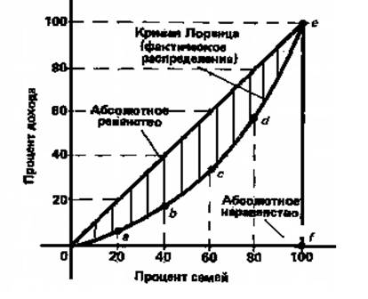 Рис. 1. Кривая Лоренца Теоретическая возможность абсолютно равного распределения дохода представлена биссектрисой, которая указывает на то, что любой данный процент семей получает соответствующий процент дохода. Это значит, что если 20, 40, 60% семей получает соответственно 20, 40, 60% от всего дохода, то соответствующие точки будут расположены на биссектрисе. Кривая Лоренца представляет собой кумулятивное распределение численности населения и соответствующих этой численности доходов. В результате она показывает соотношение процентов всех доходов и процентов всех их поручателей. Если бы доходы распределялись равномерно, то есть 10% получателей имели бы десятую часть доходов, 50% - половину и так далее, то такое распределение имело бы вид линии равномерного распределения. Неравномерное распределение характеризуется кривой Лоренца, то есть линией фактического распределения, стоящего от прямой тем дальше, чем больше дифференциация. Например, 20% населения с самыми низкими доходами получили 5% общего дохода, 40% с низкими доходами - 15% и так далее. Заштрихованная область между линией абсолютно равного распределения и кривой Лоренца указывает на степень неравенства доходов: чем больше эта область, тем больше степень неравенства доходов. Если фактическое распределение доходов было абсолютно равным, то кривая Лоренца и биссектриса совпали бы. Кривая Лоренца для России выглядит следующим образом (рис. 2).