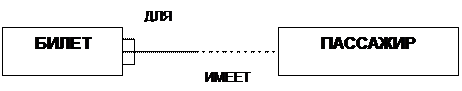 Связь между сущностями БИЛЕТ и ПАССАЖИР, показанная на рис. 9.2, связывает билеты и пассажиров. Конец связи с именем “для” позволяет связывать с одним пассажиром более одного билета, причем каждый билет должен быть связан с каким-либо пассажиром. Конец связи с именем “имеет” показывает, что каждый билет может принадлежать только одному пассажиру, причем пассажир не обязан иметь хотя бы один билет.