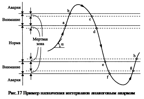 В качестве примера на рис.18 показано деление всего интервала изменения переменной y(t) на интервалы «Норма», «Внимание» и «Авария». Аларм «Внимание» возникает при у(а)<y(t)<у(b) во время нарастания наблюдаемой переменной и при y(d)<y(t)<у(с) во время ее уменьшения. Аларм «Авария» возникает при у(b)<y(t) и у(t)<y(f). Каждая критическая граница имеет зону нечувствительности (мертвую зону), которая нужна для того, чтобы после снятия состояния аларма, переменная не могла вернуться в него вследствие случайных выбросов в системе (шумов).