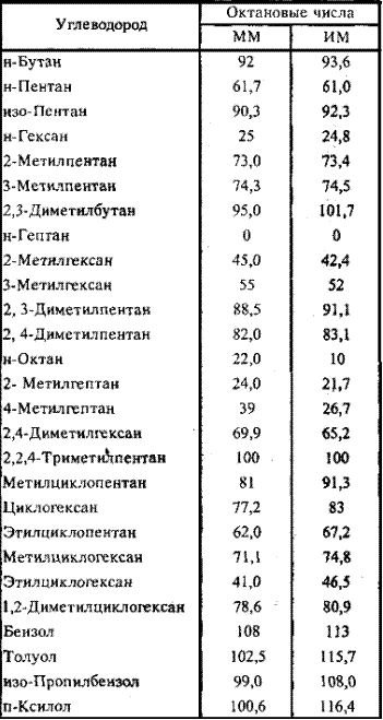 Процесс каталитического риформинга предназначен для повышения детонационной стойкости бензинов и получения индивидуальных ароматических углеводородов, главным образом бензола, толуола ксилолов - сырья нефтехимии. Важное значение имеет получение в процессе дешевого водородсодержащего газа для использования в других гидрокаталитических процессах. Значение процессов каталитического риформинга в нефтепереработке существенно возросло в 90-е гг. в связи с необходимостью производства неэтилированного высокооктанового автобензина. Бензиновые фракции большинства нефтей содержат 60 - 70 % парафиновых, 10 % ароматических и 20 —30 % пяти- и шестичленных нафтеновых углеводородов. Среди парафиновых преобладают углеводороды нормального строения и монометилзамещенные их изомеры. Нафтены представлены преимущественно алкилгомологами циклогексана и циклопентана, а ароматические – алкил бензолами. Такой состав обусловливает низкое октановое число прямогонного бензина, обычно не превышающего 50 пунктов (по ММ). Помимо прямогонных бензинов, как сырье каталитического риформинга используют бензины вторичных процессов - коксования и термического крекинга после их глубокого гидрооблагораживания, а также гидрокрекинга. Выход прямогонных бензинов относительно невелик (около 15-20 % от нефти). Кроме того, часть бензинов используется и для других целей (сырье пиролиза, производств водорода, получение растворителей и т.д.). Поэтому общий объем сырья, перерабатываемого на установках каталитического риформинга, не превышает обычно потенциального содержания бензиновых фракций в нефтях. Таблица № 3 Октановые числа углеводородов