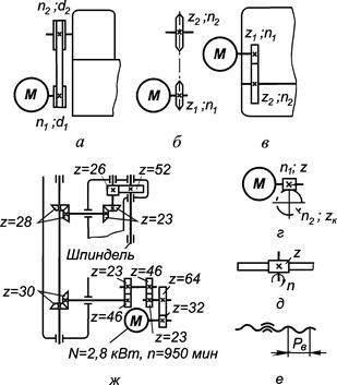 Движения в станках. Основные понятия Для осуществления процесса резания каждый станок имеет ряд рабочих органов, которым сообщаются движения, определяемые назначением станка и характером выполняемых на нем работ. Движения на станках делятся на две категории: 1) основные (движения формообразования), к которым относятся главное движение, движение подачи и в некоторых группах станков также движение деления, движение огибания; 2) вспомогательные движения не связанные с процессом резания (закрепление заготовки, закрепление инструмента, установка частоты оборотов и величины подач и т.д.). Для анализа движения рабочих органов станков на практике используют упрощенные, условные схемы механизмов, дающие наглядное представление о кинематике станков. Такие схемы называются кинематическими, а для их вычерчивания применяются условные обозначения, представленные в работе [2]. Кинематическая схема станка состоит из отдельных кинематических цепей. Под кинематической цепью станка понимают совокупность ряда передач: ременных (рис. 2, а), цепных (рис. 2, б), зубчатых (рис. 2, в), червячных (рис. 2, г), реечных (рис. 2, д), винтовых (рис. 2, е) и др., обеспечивающих передачу движения от начального звена к конечному, например, от электродвигателя главного движения к шпинделю.