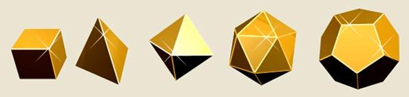 Многогранники – это пространственные замкнутые фигуры, ограниченные плоскими многоугольниками. Форма многогранника зависит от формы многоугольника, лежащего в его основании. Плоские многоугольники, ограничивающие боковые стороны многогранника, называются гранями, а линии пересечения граней – ребрами. Многогранники называются метрически правильными, если все его грани являются правильными многоугольниками. К ним относятся куб, тетраэдр, октаэдр, икосаэдр, додекаэдр (рис.1).