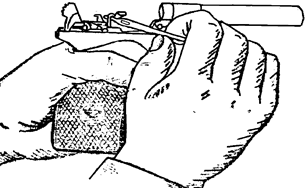 Выступом протирки снять крючок пружины шептала с затворной задержки. Указательным и большим пальцами правой руки повернуть шептало вперед до совпадения лыски на правой цапфе с прорезью цапфенного гнезда в рамке; затем шептало и затворную задержку приподнять вверх и отделить их от рамки.