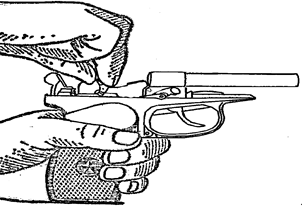 3.2. Отделить шептало и затворную задержку от рамки. Взять пистолет в левую руку; придерживая большим пальцем левой руки головку курка и нажимая указательным пальцем на хвост спускового крючка, плавно спустить курок с боевого взвода.
