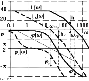 Wa(p) = 1/(Tap + 1), где Ta = 8c, то есть постоянная времени корректирующего звена больше, чем постоянные времени остальных звеньев САУ (рис.111). ЛАЧХ дополнительного звена представлена на рисунке тонкой сплошной линией. ЛАЧХ и ЛФЧХ скорректированной САУ представлены пунктирными линиями. Из рисунка видно, что изначально неустойчивая САУ после коррекции стала устойчивой. Вообще введение в прямую цепь апериодического звена с постоянной времени значительно большей, чем у звеньев исходной САУ, повышает запас устойчивости САУ. К достоинствам можно отнести также снижение высокочастотных помех и колебательности переходных процессов, о чем свидетельствует смещение вниз высокочастотной части ЛАЧХ. Поэтому такой прием повышения запаса устойчивости называется демпфированием с подавлением высоких частот. Недостаток - уменьшается частота среза wср, то есть снижается быстродействие системы.