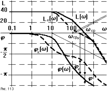 Частотные характеристики такой САУ приведены пунктирной линией на рис.113. В замкнутом состоянии САУ устойчива. Устойчивость достигается смещением вниз среднечастотной части ЛАЧХ, поэтому данный прием называется демпфированием с подавлением средних частот. Он свободен от недостатков двух предыдущих приемов и его применяют наиболее часто. Но он требует большей тщательности при подборе параметров и структуры корректирующего звена.