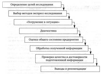 По степени детализации, глубины проводимого финансового анализа различают экспресс-анализ и детализированный анализ финансовых отчетов. С точки зрения основных направлений анализа они не отличаются друг от друга, но имеют разные целевые установки и разную степень глубины проработки проблемы. Экспресс-диагностика финансового состояния компании представляет собой обзор небольшого количества наиболее существенных показателей с целью выявления «болевых точек» в деятельности фирмы. Детализированный анализ отчетности ориентирован на глубокую проработку проблем и разработку программы действий по решению проблемных ситуаций. Алгоритм ведения исследования представлен на рис 7