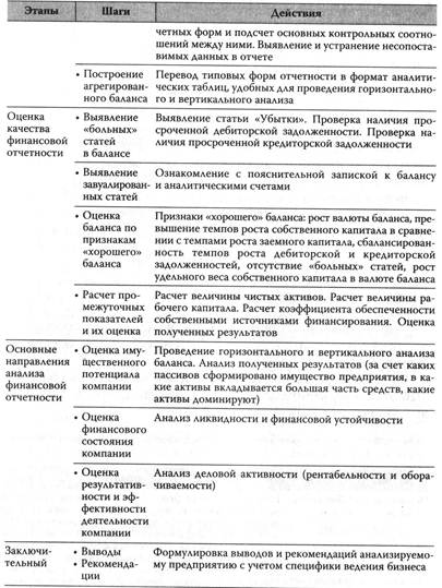 Последовательность ведения анализа финансовых отчетов включает: • получение базовой информации (о владельцах предприятия, его руководстве, видах деятельности, положения в отрасли, учетной политике и т.п.); • получение необходимых финансовых отчетов и примечаний к ним; • определение глубины и направленности (содержания) анализа; • анализ отдельных отчетов с использованием специальных методов обработки информации и интерпретация полученных данных; • прогнозирование результатов деятельности фирмы и возможности погашения его обязательств перед третьими лицами.