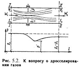 ДросселированиеДросселированием называется явление, при котором пар или газ переходит с высого давления на низкое без совершения внешней работы и без подвода или отвода теплоты. Такое явление происходит в трубопроводе, где имеется место сужения проходного канала (Рис.5.2). При таком сужении, вследствие сопротивлений, давление за местом сужения - Р2, всегда меньше давления перед ним – Р1.