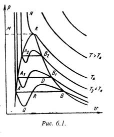 а, b – постоянные величины, первая учитывает силы взаимодействия, вторая учитывает размер молекул. a/n2 – характеризует добавочное давление, под которым находится реальный газ вследствие сил сцепления между молекулами и называется внутренним давлением. Для жидких тел это давление имеет большие значения (например, для воды при 200С составляет 1050 Мпа), а для газов из-за малых сил сцепления молекул оно очень мало. Поэтому внешнее давление, под которым находится жидкость, оказывает ничтожное влияние на её объем, и жидкость считают несжимаемой. В газах в виду малости значения a/n2 внешнее давление легко изменяет их объем. Уравнение Ван-дер-Ваальса качественно верно отображает поведение жидких и газообразных веществ, для двухфазных состояний оно неприменимо. На PV – диаграмме (рис.6.1) показаны изотермы построенные по уравнению Ван-дер-Ваальса. Из кривых видно, что при сравнительно низких температурах имеются волнообразные участки. Чем выше температура, тем короче эти части кривых. Эти волнообразные кривые указывают на непрерывный переход от жидкого состояния в парообразное при данной температуре. Точка А соответствует состоянии жидкости, точка В относится парообразному состоянии вещества.