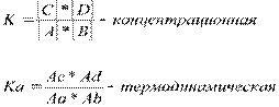 Концентрация веществ, имеющая место в системе с момента наступления равновесия, называется равновесной. Эти концентрации остаются неизменными столько долго, сколько не изменяется внешние условия. Равновесная концентрация вещества зависти от его исходной концентрации и расхода вещества на протекание реакции до момента установления равновесия. т.о. аналитическая концентрация - это общая концентрация вещества в растворе, независимо от формы его содержания (ионы, молекулы). Для обратимых реакций А+В↔С+Д закон действия масс записывается в виде константы равновесия