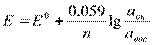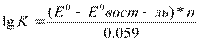 12. Константа равновесия ОВР. Возможность протекания ОВР в противоположн.направлении свидетельствует о ее обратимости. Обратимые хим.р-ции хар-ся константой равновесия. ОВ потенциалы соответствующих редоксопар опр-ся Ур-ем Нернста. где, n- общее число электронов переходящих от ок-ля к восст-лю. Применение ОВР в анализе многообразно: для обнаружения ионов, для количественного обнаружения ионов, разделения ионов, устранения мешающих анализу ионов.