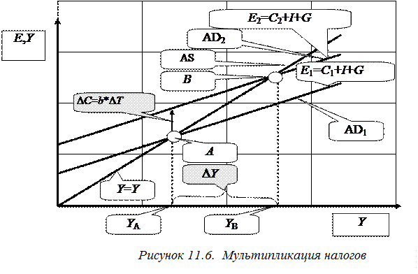 Сумма в 24 млрд руб. и начинает мультиплицировать (рис. 11.6). Поэтому общий прирост объемов национального производства Y будет меньше, чем в двух предыдущих случаях.