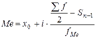 Медиана в интервальном ряду распределения определяется в следующем порядке. 1. Подсчитываются накопленные частоты по данному ранжированному ряду распределения. 2. На основе накопленных частот устанавливается медианный интервал. Он находится там, где первая накопленная частота равна или больше половины совокупности (всех частот). 3. Вычисляется медиана по формуле: