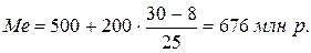 Вычислим медиану по данным табл. 5.8. Первая накопленная частота, которая равна половине совокупности 30, значит медиана находится в интервале 500-700.