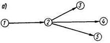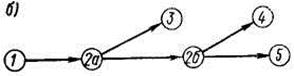 Рисунок 6.4 - Разделение работы (1,2) на части, необходимые и достаточные для начала работ (2а, 3); (2б, 4); (2б, 5): а — работы (2,3), (2,4), (2,5) ждут полного окончания работы (1,2); б — работы (2,3), (2,4) могут быть начаты, не ожидая окончания всей работы (1,2)