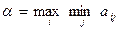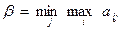 Число α, определяемое по формуле (7.1), называется нижней чистой ценой игры (максимином). Оно показывает, какой минимальный выигрыш может получить игрок А, правильно применяя свои чистые стратегии при любых действиях игрока В. В свою очередь, игрок В, стремясь минимизировать проигрыш, при выборе наиболее предпочтительной стратегии использует принцип осторожности так: сначала он для каждой чистой стратегии Вj (