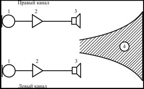 Рис. 128. Функциональная схема двухканальной системы стереофонической звукозаписи: Звуковое поле пространственного источника звука воспринимается двумя микрофонами, преобразуется в электрический сигнал, подвергается усилению и воспроизводится двумя громкоговорителями. Максимальная локализация источников звука в стереофонической системе достигается прослушиванием фонограммы через стереонаушники, так как в этом случае звук от левого канала попадает только в левое ухо слушателя, а от правого – только в правое. При использовании двух громкоговорителей каждое ухо слушателя воспринимает звук от обоих громкоговорителей. В этом случае стереоэффект ослабевает. Слушатель, находящийся в зоне стереоэффекта, ощущает объемность звука. Возникает возможность определить направление на источник звука. Качество звучания улучшается, повышается его естественность. При стереофоническом звуковоспроизведении менее заметны на слух частотные и нелинейные искажения. Двухканальная стереофония нашла широкое применение в радиовещании, механической, магнитной и оптической записи звука. Огромное число записей на грампластинках, аудиокассетах и лазерных компакт-дисках ориентировано на двухканальную стереосистему.