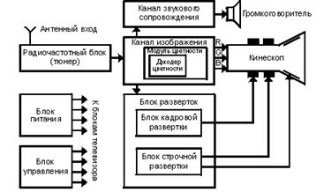 Рис. 173. Упрощенная блок-схема цветного телевизора Модуль цветности мультисистемных телевизоров, т. е. работающих в разных аналоговых системах цветного телевидения, дополнительно содержит декодер цветности, преобразующий сигналы цветности других стандартов в стандарт, в котором работает телевизор. Большинство современных телевизоров являются мультисистемными. Полный видеосигнал подается в канал синхронизации. Здесь из него выделяются строчные и кадровые синхроимпульсы, которые управляют работой генераторов строчной и кадровой разверток соответственно. Действуя на кадровые отклоняющие катушки, ток генератора кадровой развертки обеспечивает перемещение электронного луча по вертикали. Модуль строчной развертки обеспечивает развертку луча кинескопа по горизонтали. Там же, в модуле строчной развертки, вырабатывается высокое напряжение, необходимое для работы кинескопа. Синхронное действие полного видеосигнала, строчных и кадровых разверток на кинескоп приводит к формированию изображения на экране. Для соединения с внешними устройствами, например видеомагнитофоном, по низкой частоте, схема телевизора содержит соответствующий модуль. Питание телевизора осуществляется с помощью модуля питания, преобразующего напряжение сети в напряжения, необходимые для работы остальных модулей телевизора. Управление всеми элементами схемы телевизора осуществляется с помощью модуля управления, режимы работы которого задаются кнопками на корпусе телевизора и ПДУ.