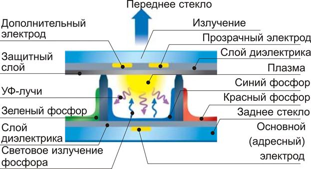 Плазменная, или газоразрядная, панель в простейшем случае представляет собой два расположенных на небольшом расстоянии друг от друга плоскопараллельных стекла. Объем между ними заполнен инертным газом. Используется свойство электрического разряда в толще инертного газа превращаться в плазму. Возникающее при этом ультрафиолетовое излучение, воздействуя на люминофоры первичных цветов, вызывает их свечение (рис. 180). Подобный принцип используется в люминесцентных лампах. Если создать панель, на которой расположено достаточно много упорядоченных газоразрядных ячеек, каждой из которых можно управлять отдельно, мы получим аналог телевизионного экрана. Видеосистемы с применением плазменных панелей с диагональю 21–42" широко используются как информационные и рекламные табло, а также в качестве телевизоров высокого класса, компонентов домашнего кинотеатра.
