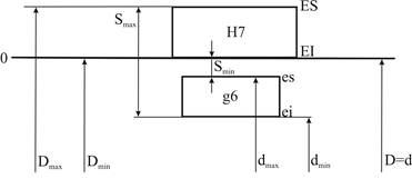 В зависимости от взаимного расположения полей допусков вала и отверстия, которые, как указывалось, определяют предельные размеры, возможно образование трех групп посадок: 1-я с зазором: 3-я переходная. В посадках с зазором предельные размеры отверстия Dmax, D min больше предельных размеров вала dmax, dmin и поле допуска отверстия H7 расположено выше поля допуска вала f6, как показано на рис 4.5. Причем номинальные размеры D= d.