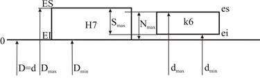 Предельные натяги показаны на рис 4.6 в виде отрезков. В переходных посадках поля допусков вала и отверстия перекрываются и для одной пары соединяемых деталей возможно получения зазора, а для другой натяга. Схема расположения полей допусков показана на рис. 4.7. Поэтому характеристикой переходной посадки является наибольший зазор – Smax и наибольший натяг Nmax, которые определяются по формулам, приведенным выше.