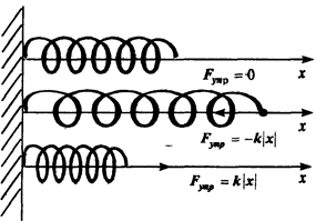 В законе Ньютона сила есть физическая величина, характеризующая действие одного тела на другое и сообщающая последнему ускорение. Сила может также приводить к изменению формы и объема тела. В этом случае происходит деформация тела. Что происходит в действительности при приложении силы — ускорение тела или его деформация — определяется самими свойствами тела. Более того, свойства тела определяют и характер деформации, которая может быть упругой и неупругой. Неупругая деформация характеризуется тем, что она не исчезает после снятия нагрузки. С неупругой деформацией связано изменение внутренней энергии тела. Напротив, если после снятия нагрузки деформация исчезает и тело возвращается к своей прежней форме, то деформация является упругой. Сила, возвращающая тело к своей прежней форме, — упругая сила. Как показывает опыт, упругая сила пропорциональна созданной в теле деформации. Соответствующий закон называется законом Гука: F =- k x, (1.62) где k — коэффициент пропорциональности, а x — величина деформации тела (см. рис.): x > 0 при растяжении тела, x < 0 — при сжатии. Вычислим работу, совершаемую против упругой силы, при деформации одномерного стержня на dx: