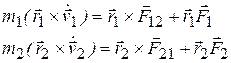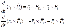 Мы видели, что механические свойства замкнутой системы не изменяются при ее параллельном переносе в пространстве. Это свойство является следствием однородности пространства, то есть отсутствием каких-либо выделенных точек пространства, физические свойства системы не должны изменяться также и при ее поворотах в пространстве, ввиду отсутствия в пространстве выделенных направлений, что означает изотропность пространства. Оказывается, что неизменность физических свойств системы при ее поворотах в пространстве также приводит к сохранению некоторой новой механической величины — момента импульса системы. Рассмотрим систему, состоящую из двух взаимодействующих частиц, на которую действуют также внешние силы. Уравнения движения частиц имеют вид: