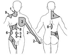 Рис.. Схема расположения на туловище и конечностях некоторых зон Захарьина-Геда, в которых может появляться отраженная боль при ряде заболеваний внутренних органов[Б21]: 1 — легкие и бронхи, 2 — сердце, 3 — кишечника, 4 — мочевого пузыря, 5 — мочеточника, 6 — почек, 7 и 9 — печени, 8 — желудка, поджелудочной железы, 10 — мочеполовой системы[Б22].