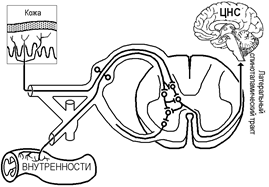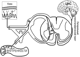 Вероятные механизмы возникновения отраженной боли показаны на рис. и. Одна из причин отражённой боли — конвергенция ноцицептивных афферентов от кожи и внутренностей на одних и тех же клетках, дающих начало восходящим ноцицептивным трактам (рис.).