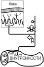 Рис.. Пути возникновения отраженной боли. В некоторых случаях ветви одного и того же ноцицептивного афферента иннервируют и поверхностную, и глубокую ткани.