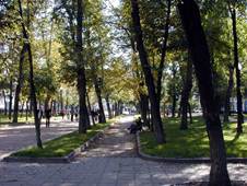 В застройке бульвара преобладают новые, выполненные их крупных индустриальных конструкций здания; только один квартал – реконструированные жилые дома XVIII в. С любовно проработанными деталям. Планировка бульвара имеет подчеркнуто осевой и симметричный характер, который усиливает центральная платановая аллея. Однако самое яркое – это исторические произведения искусства и возрожденная из обломков историческая скульптура, наполняющие пространство бульвара, включенные в новую композицию как ее узловые элементы и акценты. В результате создана новая, не только функционально, но эмоционально насыщенная среда, в которой соединены современность и традиция. [3] Лайсвес-аллея в Каунасе (рис. 31) – исторически сложившаяся главная улица Каунаса – еще в XIX в. была расширена, а ее центральная часть превращена в бульвар.