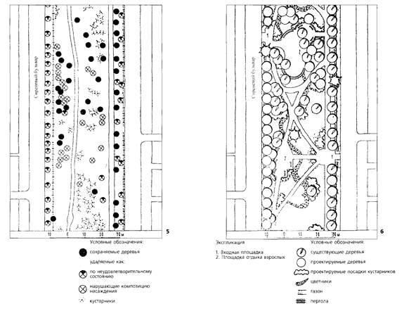 На первом этапе реконструкции (рис. 29) предлагается удалить наиболее угнетенные и потерявшие жизнеспособность растения. Часть лип мелколистных, высаженных вдоль проезжей части, требует замены, так как они уже не справляются со своей защитной функцией. На втором этапе необходимо заняться пространственной структурой насаждений путем создания компактных групп из деревьев и кустарников, как существующих, так и вновь проектируемых. Рекомендуется единично ввести в них хвойные виды, которые заметно оживят пейзаж. Вдоль проезжей части планируется посадка липы крупнолистной. Кроны этих деревьев должны формироваться в виде параллелепипеда или шара путем обрезки по специальному садовому шаблону. Частично будет изменена планировка участка, дорожная сеть станет более удобной для пешеходов. На рис. 34 показан цветник в виде ленты, пронизывающей данный участок бульвара. [22]