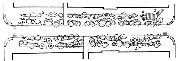 Рис. 32. Улица Абовяна в Ереване (арх. Ф. Дарбинян), план квартала 1 –место отдыха; 2 – пергола; 3 – цветник; 4 - бассейн