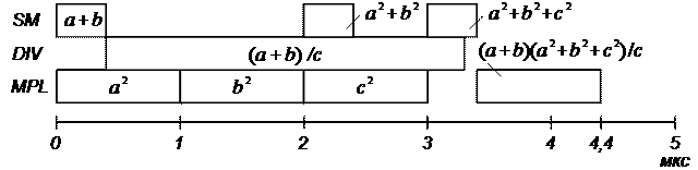 Рис. 9.5. Временная диаграмма вычисления выражения Из-за большой сложности АЛУ блочного типа применяются только в высокопроизводительных вычислительных системах. Однако успехи интегральной технологии возродили интерес к таким структурам из-за возможности наращивания вычислительной мощности путем подключения дополнительных блоков без каких-либо изменений в остальных устройствах. Разработаны и выпускаются ИМС различных арифметических расширителей, которые при необходимости повышения быстродействия подключаются к основному АЛУ. Такие расширители выделяют из потока команд «свои» команды и быстро их выполняют.