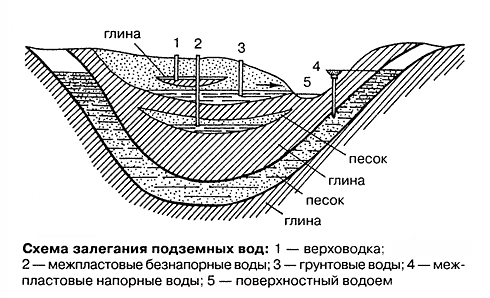 Генетические типы четвертичных отложений: Речные (аллювиальные) – а; Ледниковые (гляциальные) – g; Водно-ледниковые (флювиогляциальные) – fg; Озерно-аллювиальные la; Склоновые (делювиальные, делювиально-пролювиальные) - d,dp; Болотные – h; Техногенные – t. Подземные воды. Вода, сосредоточенная в горных породах на различной глубине называется подземной. Вода в горных породах заполняет поры или трещины и движется от высоких абсолютных отметок к низким отметкам.