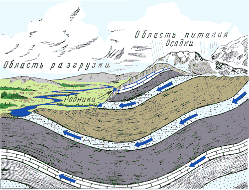 Схема формирования питания и разгрузки подземных вод Питание – атмосферные осадки Разгрузка – природные дрены (реки, озера, моря), разгрузка родниками Состав – определяется типом (способностью к растворению) и составом пород Разгрузка подземных во в виде источника